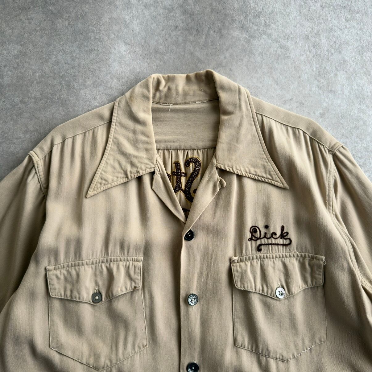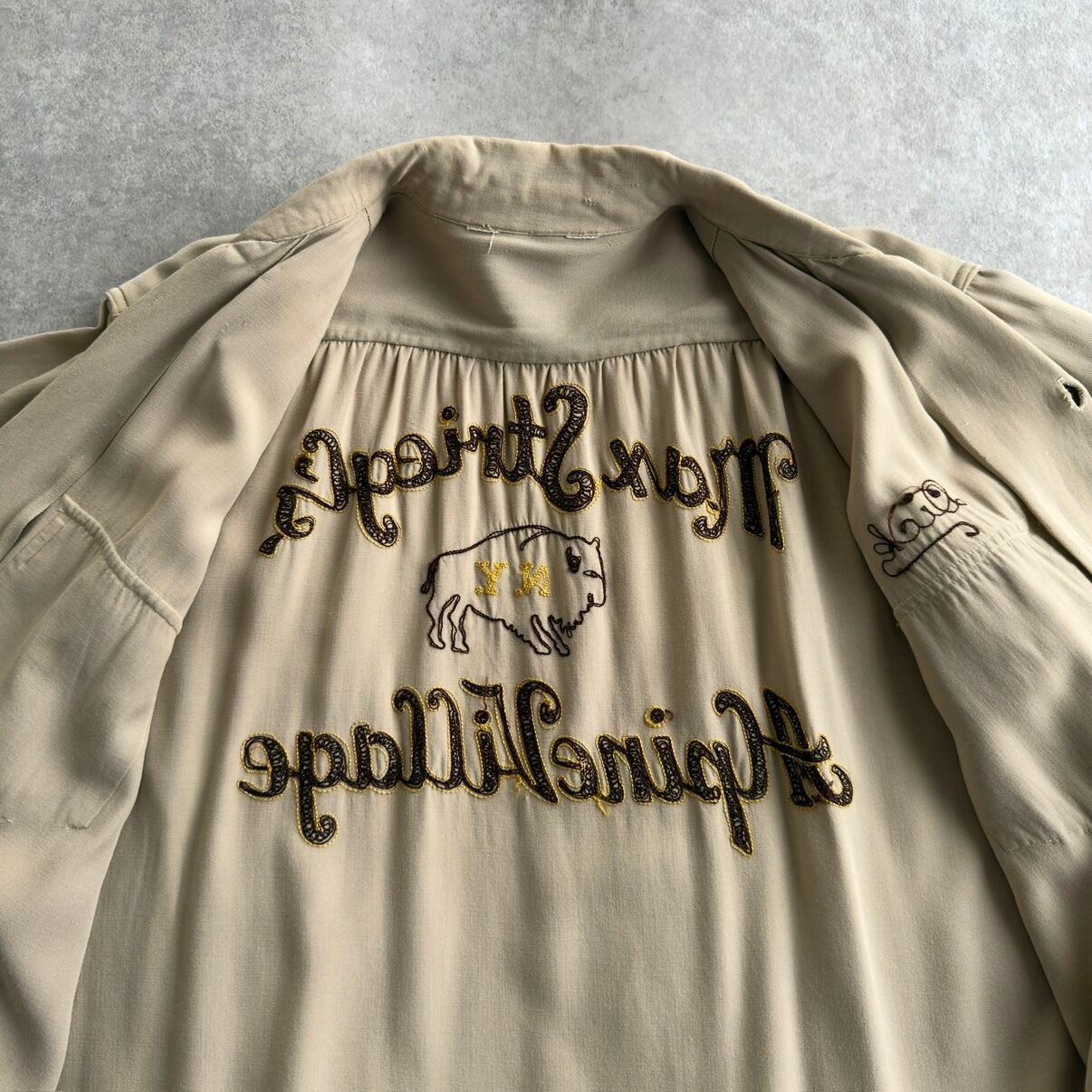 レーヨンギャバジンの生地でワークシャツ調の珍品に加え、豪華なバッファローなどのチェーンステッチが施された1着。