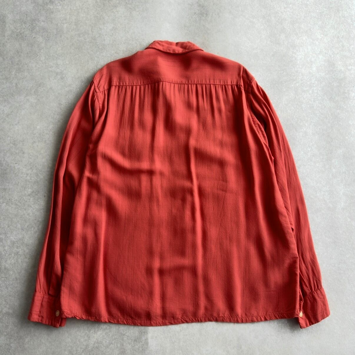オレンジボディーにブラックの絣が入るレーヨン生地のシャツ。