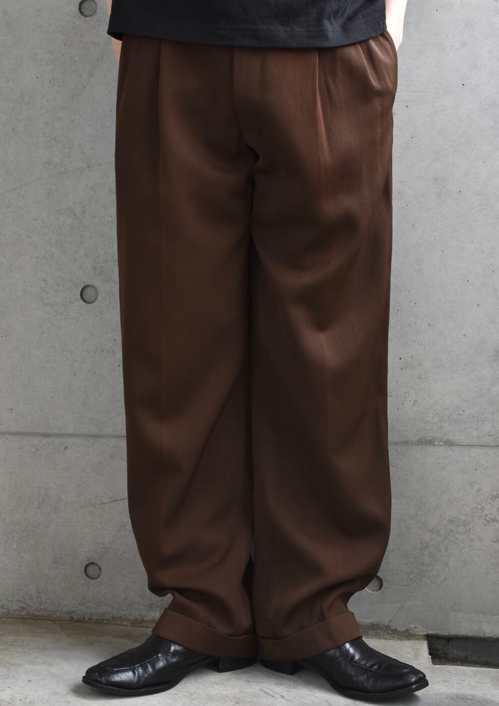 落ち着いたブラウンの色味、ワイドなストレートシルエットとかなり使いやすいスラックス。