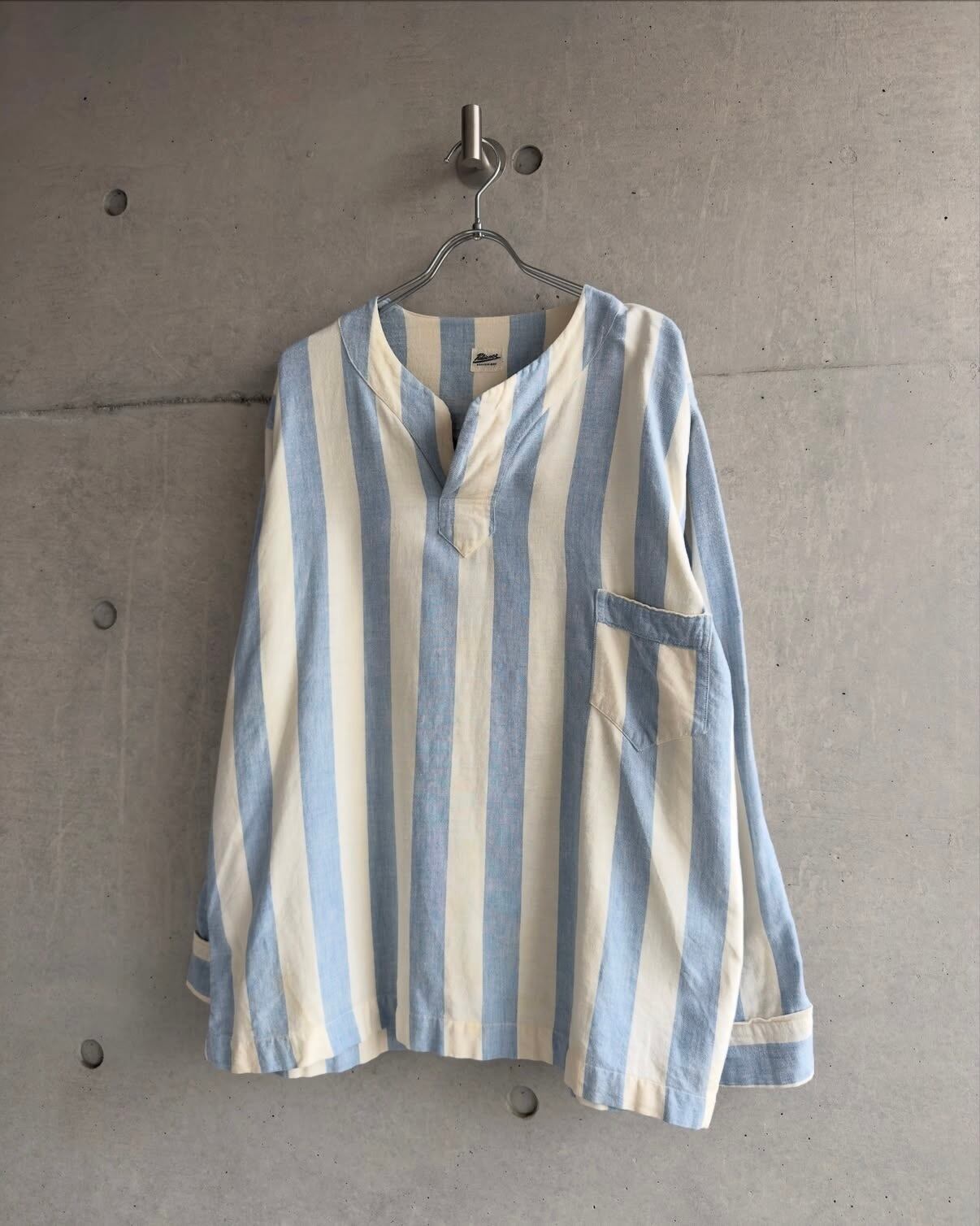 ライトブルーとオフホワイトのストライプやボックスシルエットが現代のファッションとしても落とし込みやすく、洋服としてお洒落な1着かと。